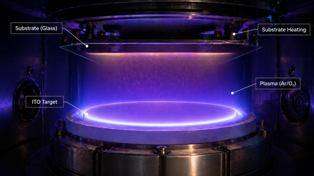 During the sputtering process, some oxygen is lost to the vacuum pumps, leading to oxygen-deficient films that are highly conductive but optically dark (brownish or metallic). To counteract this, a precisely metered mixture of Argon ($\text{Ar}$) and Oxygen ($\text{O}_2$) gas is introduced into the chamber.
